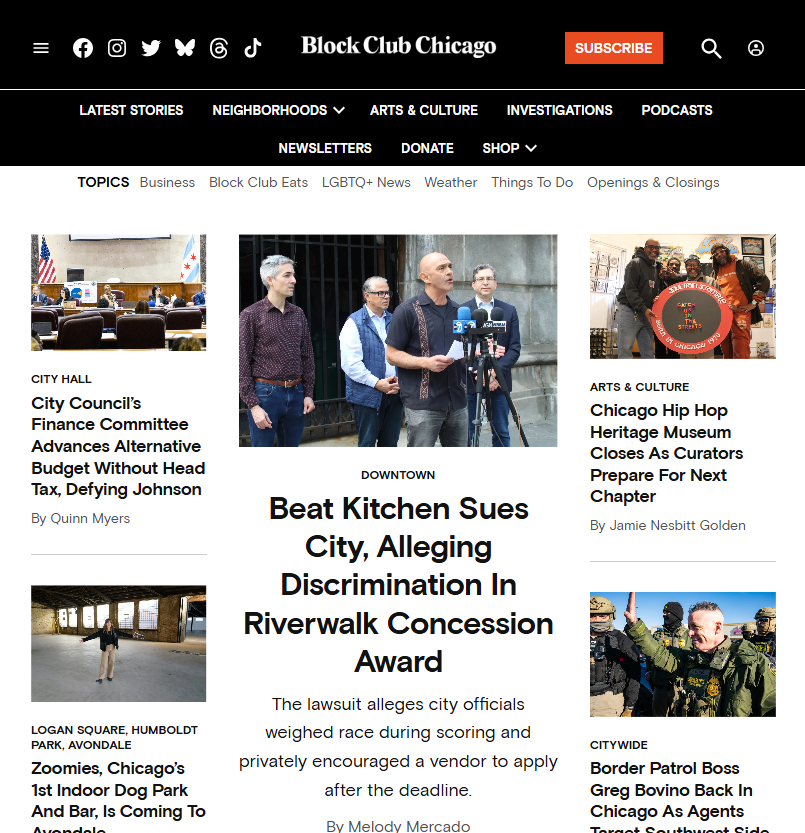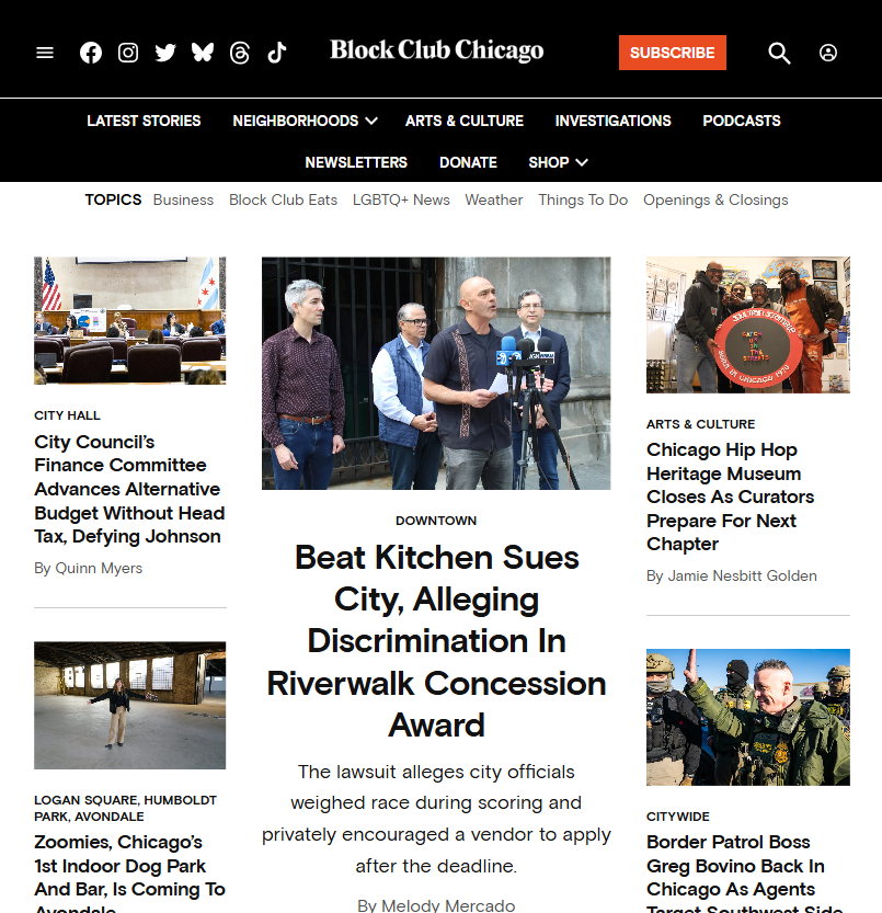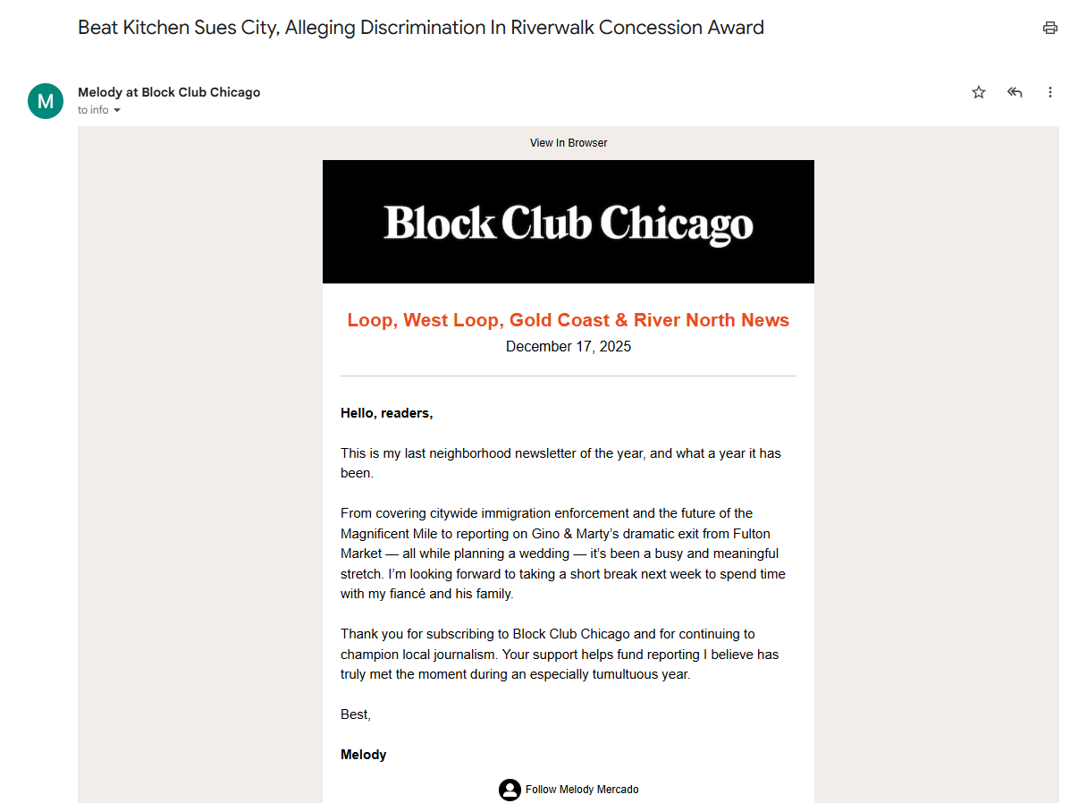 Melody Mercado’s reporting for Block Club Chicago follows Robert Gomez’s federal lawsuit challenging the City of Chicago’s handling of the Riverwalk concession process. The coverage details allegations that city officials privately solicited a late proposal, altered scoring, and considered race during the evaluation, raising broader questions about transparency, procurement rules, and public oversight in the awarding of city contracts.